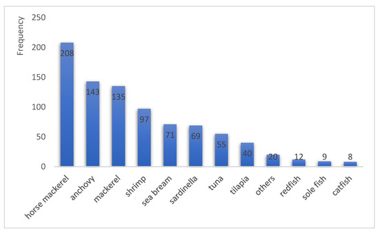 Understanding socio-demographic features of the sampled households is necessary as it affects their fish consumption preferences and frequency. They are presented in Table 2. Socio-demographic characteristics of the respondents show that the household head of most of the households (72%) are men. The average household size is five persons, with the average age of household head being 41 years old. In terms of education, the results indicate that three-fourths (76%) of the respondents have junior- and senior- secondary education level. In addition, the monthly income of the household is, on average, 336 US dollars (USD). The average price of seafood consumed by the respondents is USD 1.8 per kg, with majority of the seafood price falling, on average, in the group of USD 1 and USD 2 (Table 2). The majority (92%) of the respondents have reported that the seafood they purchase/consume are of high or good quality. 37% of the respondents have reported being located in an area close to the sea and in the surrounding areas of maritime region, as compared to consumers living in the upper north of the country, so far from the coast. More importantly, the respondents were asked how often they purchased and consumed seafood in the last 12 months. The answers provided by the respondents show that, on average, the sampled households purchase and consume seafood 14 times a month. In other words, this represents, on average, an approximate household expenditure on seafood of USD 40.67 per month. In terms of the type of fish consumed, eleven (11) species have been listed by the respondents. Horse mackerel, anchovy, mackerel, shrimp and sardinella were reportedly said to be the top five ones consumed by 67.5%, 47.4%, 43.8%, 31.5% and 23%, respectively, by the sampled households (Figure 1). Furthermore, 65% of the households have expressed the WTP for shrimp locally produced, if available, with, on average, USD 1.2 per kg as the expected amount of that WTP.