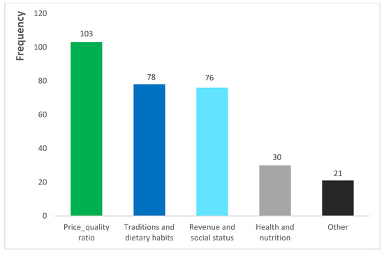 Regarding the reasons for consuming seafood, we gave the respondents five options (i.e., quality-price ratio, tradition or dietary habits, revenue and social status, health and nutrition, and other). They were asked to rank the most important factor taken into consideration when deciding to purchase fish/shrimp. The results show that residents across Togo attach great importance to the quality of seafood they purchase and consume (Figure 2). Tradition or dietary habits is the second main reason for fish/shrimp consumption. For 38.5% of the respondents who reported not to consume shrimp, the main reason is that they do not like it.