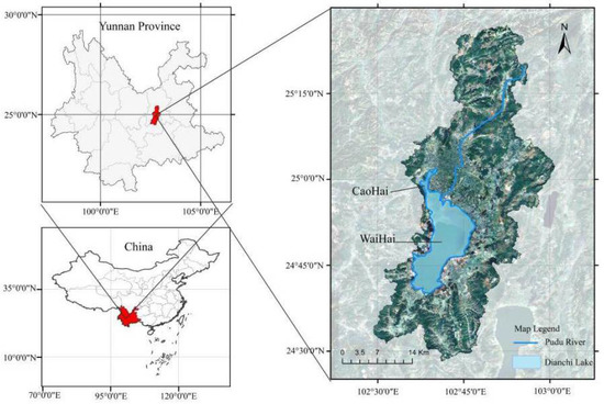 As shown in Figure 1, the Dianchi Basin is located in the center of the Yunnan Plateau, between 102°29′~l03°01′ E and 24°29′~25°28′ N. The lake covers an area of 309.5 km2 and consists of Waihai and Caohai. The normal water level of Waihai is 1887.5 m and Caohai is 1886.8 m. The area of the watershed is 2920 km2, including 52 sub-district offices and 2 towns in the Wuhua, Panlong, Guandu, Xishan, Chenggong and Jinning districts of Kunming, with a population of more than 4 million. The average annual rainfall in the basin is 953 mm. The Dianchi Basin belongs to the northern subtropical monsoon climate. The dry season is from November to April, which is mainly controlled by the tropical continental air mass with clear and little clouds, abundant sunshine, strong total radiation, large evaporation and a warm and dry climate. From May to October, it is mainly affected by the southwest monsoon and enters the rainy season, with more precipitation and higher humidity. These characteristics are combined with high altitude and low latitude to form a climate characterized by warm winters and cool summers. The topography of the Dianchi Basin is high in the north and low in the south. Generally, it presents an asymmetric step-like landform pattern with Dianchi Lake as the center, wide in the south, north and east, and narrow in the west. Its unique geographical location and superior natural conditions have made the Dianchi Basin the political, economic, cultural and transportation center of the province. The semi-enclosed lake shape makes the water ecological environment of Dianchi Lake very fragile, which cannot withstand the increasing population pressure and intensive land use. After suffering from environmental pollution and ecological damage, it is difficult to restore.