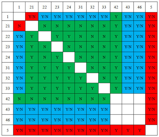 Rationality judgment matrix of land use change. The number in the first column is the code of land use type before the change, and the number in the first row is the code of land type after the change. The code and name are 1—cultivated land, 21—forest land, 22—shrub land, 23—open forest land, 24—other forest land, 31—high coverage grassland, 32—medium coverage grassland, 33—low coverage grassland, 42—lake, 43—reservoir and pond, 46—tidal flat, 5—construction land. Each grid represents a type of land use change. The alphabetic “Y” in the grid means that the land use change is rational and the alphabetic “N” in the grid means that the land use change is irrational. “Y/N” means that evaluators need to comprehensively judge the rationality of changes by combining land use suitability, relevant national laws and regulations. Blank grids indicate no change, so they were not included in the rationality evaluation of land use change.