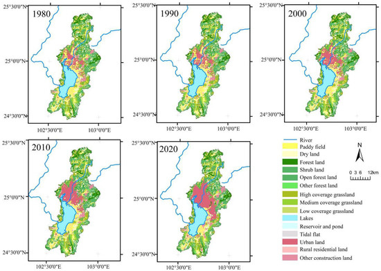 Spatial-temporal change of land use in Dianchi Basin from 1980 to 2020.