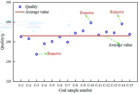 In order to further reduce the test error, the samples obtained from the preliminary screening are weighed, and the coal samples with large mass differences are removed. The quality test results of the coal samples are shown in Figure 1. Through comparison, the C-3 sample, C-10 sample, and C-14 sample are finally eliminated. After screening the coal samples, the mass ranges between 258.19 and 271.22 g, the height is between 99.12 and 100.57 mm, and the diameter is between 49.38 and 50.22 mm.