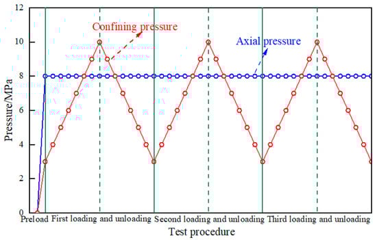 Confining pressure loading stage: keep the axial pressure at 8 MPa, keep the gas pressure at the set pressure, and load the confining pressure to 10 MPa at the loading rate of 0.05 MPa/min, so as to complete one-time loading; confining pressure unloading stage: during this process, keep the axial pressure and gas pressure unchanged, unload the confining pressure to 3 MPa at the rate of 0.05 MPa/min, so as to complete one unloading. Complete three loading and unloading cycles for each coal sample with the above steps. During the test, record the data every time the confining pressure increases (decreases) 1 MPa. The stress paths of confining pressure and axial pressure are shown in Figure 2.