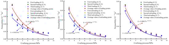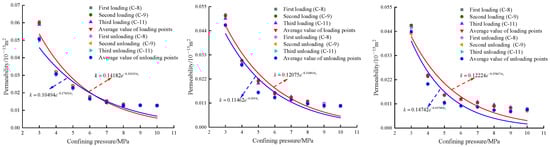 Since the approximate change trend of coal sample permeability in the loading stage and unloading stage is relatively similar, the change trend of average permeability and confining pressure of each group of coal samples is fitted. The fitting results are shown in Figure 3, Figure 4, Figure 5 and Figure 6. Comprehensive analysis shows that the relationship between permeability and confining pressure shows a negative exponential change, and the general fitting formula is shown in Equation (2).