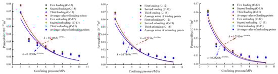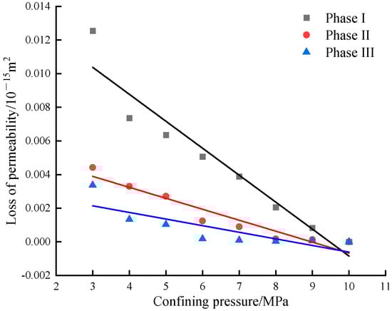It can be seen from Figure 9 that with the increase of confining pressure, the permeability loss of coal samples gradually decreases. Due to different confining pressures, the loading and unloading time of coal samples are different, which leads to different degrees of closure and recovery of cracks in the samples. The amount of permeability loss is also different. When the confining pressure is loaded from 3 MPa to 10 MPa and then unloaded to 3 MPa, the coal sample is loaded for the longest time and the permeability loss is the most, while when the confining pressure is 10 MPa, the coal sample is loaded for the shortest time and the permeability loss is the least.