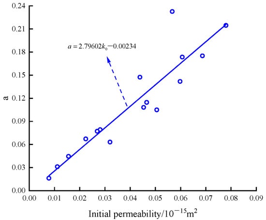 In the general formula of permeability changing with confining pressure, the value of a is related to the initial permeability, that is, in different loading and unloading stages, it is related to the permeability when the confining pressure is 3 MPa. The relationship between the fitting coefficient a and the initial permeability is shown in Figure 7. That is, the fitting coefficient increases linearly with the increase of initial permeability.