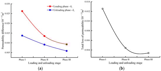 It can be seen from Figure 8a: the permeability loss in the loading stage decreases with the increase of loading times, and the permeability recovery during unloading also decreases with the increase of unloading times. At the first loading, the permeability difference of the coal sample is the largest, indicating that the number of closed pores and fractures in the coal sample is the largest at the first loading. With the increase of loading times, the permeability difference gradually decreases, that is, with the increase of loading times, the number of closed pores and fractures in the coal sample also decreases; at the first unloading, the permeability difference of coal sample is also the largest, indicating that the recoverable deformation of coal sample is the most during the first unloading. With the increase of unloading times, the permeability recovery difference decreases, that is, with the increase of unloading times, the recoverable deformation of coal sample becomes less and less.