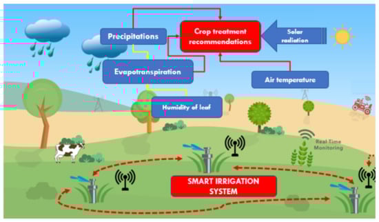 The precision agriculture domain refers to specific agricultural activities and productivity components, including the hardware and software resources used to ensure reliable (precise) results in terms of productivity yields. The overall components related to soil, air, crops, and meteorological phenomena that affect productivity and overall yield, including soil-related aspects, fertilization, the degree of contamination, dryness/excessive humidity, etc., are addressed in [,,,]. Atmospheric phenomena also bring a considerable influence over mandatory stages related to crop development and management, too. Solar energy is relevant for all stages of crop development, from seed germination to flowering/fruiting, and its effects can be either positive or negative [,,,]. Green plants use photosynthetically active radiation (PAR) for photosynthesis. PAR varies with latitude, season, clouds, etc. []. Regarding grapevine leaves’ resistance to downy mildew (Plasmopara viticola), the leaves receiving 100% solar radiation should have fewer mildew problems than the shadowed leaves []. Solar radiation also has a significant role in evaporation and transpiration evaporation processes and, since they are interconnected, the common term to express them is crop evapotranspiration (crop ET) []. Moreover, the air temperature strongly influences the type of crop that can be grown in a certain geographical area since crops have “biological clocks”. Regardless of the use-case (e.g., flowering onset time changes of alpine ginger Roscoea, Ferrugem_Branca in maize crop or wilt in sugarcane crop [,,,], there are crops resilient to low temperatures and others that have an efficient development in a warm environment. The ambient temperature influences the metabolism of berry grapes since elevated temperatures severely affect it, leading to low wine quality []. Along with air temperature, wind speed and direction, and air pressure, precipitation (daily/monthly amount) must be considered in growth prediction and disease estimation degree of grapes, and it can be classified as convective/cyclonic/frontal/orographic []. Precipitation has a strong influence on spreading pathogens and pests, leading to severe crop diseases in plants, including fungal diseases such as black rot (Guignardia bidwellii), powdery mildew (Uncinula necator), downy mildew, Pierce’s disease (Xylella fastidiosa), and Phylloxera (Daktulosphaira vitifoliae) [,,,]. The influence of vegetation on precipitation can be both positive and negative. The richer the vegetation, the higher the ET; thus, the amount of water in the atmosphere increases, meaning that the precipitation’s volume increases. ET is vital in water resources management and irrigation-efficient planning projects in smart cities and smart agriculture []. Thus, crop diseases are associated with unacceptable weather conditions and improper use of pesticides/fertilizers. Some are easily identified (diseases with distinct spectral signatures), while when multiple biotic and abiotic conditions with similar spectral characteristics are used in a cultivation area, they are more difficult to detect, if not impossible []. Different technologies (e.g., machine learning (ML) techniques, sensors image processing, etc. []) and smart systems are involved in crop disease assessment, prevention, and control. Furthermore, the global digital agriculture market grew by USD 0.6 billion from 2020 to 2021, and technologies such as Big Data, blockchain with Internet of Things (IoT) and 5G capabilities, security, and privacy solutions, provide reliability and efficiency of precision agriculture systems. IoT integration in smart farming target applications varies from typical large farming operations to organic and/or family farming, and enhances highly transparent farming []. The complexity of precision agriculture systems increases with the integration of wireless sensor networks (WSNs) with dedicated sensors, control systems, robotics, autonomous vehicles, automated hardware, etc. Moreover, WSNs and IoT capabilities improved the efficiency of smart agriculture systems by providing reliable parameters’ estimates such as soil and air humidity, soil and air temperature, solar radiation index, evapotranspiration, fertilizer presence, and crops development progress [,,,,]. To overcome the negative effects of the ongoing climate on crops’ health, several advanced solutions were presented [,,,]. Other extensions of IoT and WSNs applications refer to the management of greenhouses and production process, monitoring and optimization of crop development in farmland, and activities related to crop protection against animal attacks [,,,,].