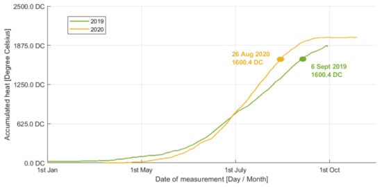 Although the necessary daily temperature for a crop to grow does not vary from year to year, depending on the atmospheric conditions, DAH received by crops can vary. In addition, the GDD parameter can be computed to predict the suitability of a region for the production of a particular wine-grape variety and/or to predict the best timing of fertilizer or pesticide spread []. Therefore, this parameter is also represented in the experimental part of this paper.