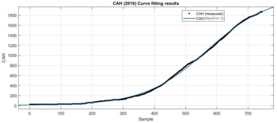 Considering the time series statistical results in 2019 and 2020, the curves that best reflect the CAH for each time series are the sigmoids given in Equation (3), with A, B, , and given in Table 5. Figure 5 reveals the results of the curve-fitting stage for the 2019 CAH data for the parameters in Table 5.