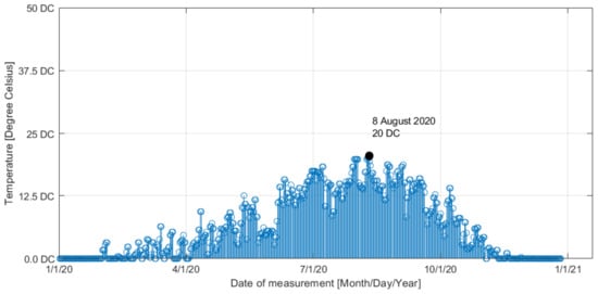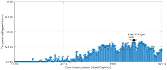 They output the permanently registered quantity of heat received daily by grapes. For example, Figure 6 shows that for 2019, the hottest 2 days were registered during 8 August and 13 August, with 17.3 DC accumulated during each of these 2 days. Using smoothing spline estimates for the daily amount of heat received by grapes in 2019, we obtained an RMSE of 0.3818 DC, for a smoothing parameter .