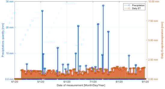 For instance, on 10 May 2019, total precipitation amounted to 4.8 mm (Figure 8), while the crop ET needed was only 0.66 mm. The daily imbalance characterized the 2019 wine-growing season, in which the total precipitations exceeded the necessary amount of precipitation. For example, the total level of precipitations during June 2019 visibly exceeded the necessary amount. However, following 20 July 2019, this imbalance was reversed during the berries ripening interval. Only 12 mm of precipitation fell during this interval, considerably less than the total 41.78 mm of ET.