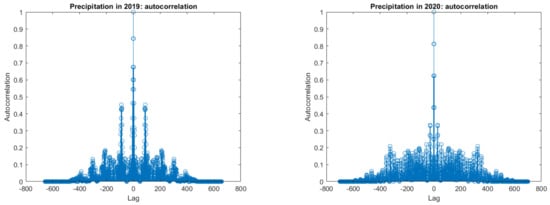 The autocorrelation of the 2019 and 2020 precipitation data is depicted in Figure 10 and shows a weak correlation between the samples of the experimental data for both years. Except for the 0-lag, where the autocorrelation is 1, the maximum autocorrelation for non-0-lags is 0.843 for 2019 and 0.811 for 2020, obtained for 1-lag.