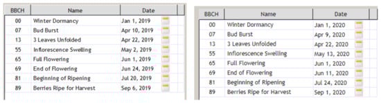 Based on Figure 11, for both monitored years, the data for each particular activity are similar, so it is intuitive and facile to make predictions regarding these stages for the next year. Therefore, the data in Figure 11 outline the reliability of the precision agriculture platform that provides valuable data for the prediction of several stages in grape growth.