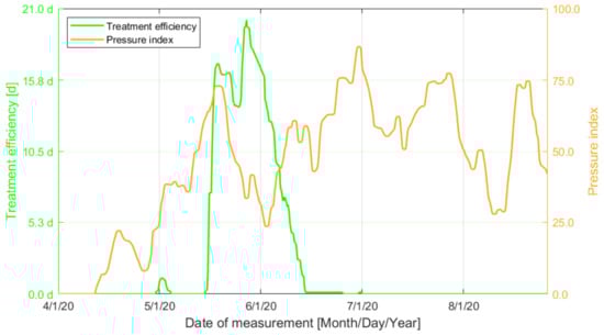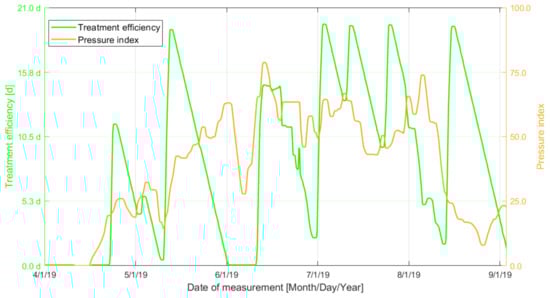 The green line reflects the efficiency of the treatment applied against powdery mildew. The treatment efficiency is not an efficiency computed as a non-dimensional ratio between useful treatment and total treatment applied. However, it is determined by the ADCON platform, following the input by the farmer of the data associated with the performed treatment (for example, the substances used by the owner, the estimated number of days that the treatment may last). Based on the variation of temperature, humidity, and precipitation, the platform decreases or increases the number of days associated with the treatment efficiency (for example, precipitations decrease the treatment efficiency because the sprayed substances’ efficiency is loosened).