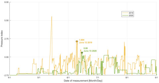 Three primary diseases affecting wine-grapes production are considered for the analysis: powdery mildew, grape bunch rot, and grape downy mildew []. For each monitored disease, as well as for other monitored parameters, the platform has continuously monitored these parameters and issued recommendations. To achieve this, phenology aspects referring to the study of annual events in nature, events affected by seasonal changes including climate and weather, are involved in assessing disease occurrence probability. A phenological calendar is a valuable tool for communicating general climate features and the effects of climate change to the interested parties. Based on the phenological calendar estimations, the precision agriculture platform has continuously assessed the risk of significant disease occurrence due to weather conditions for the wine-grape crop. Disease pressure on leaves and berries is evaluated based on the pressure index that is real-time determined considering the probability of disease occurrence and probability of disease development based on the interaction between leaf wetness duration and temperature []. Interpretations of disease pressure index values are illustrated in Table 3.