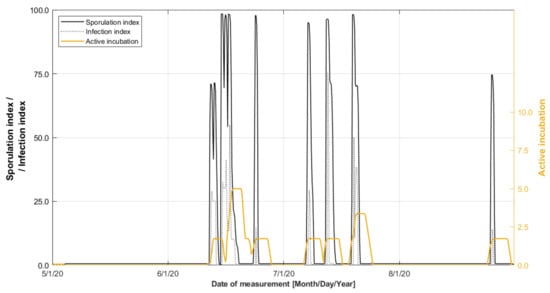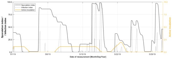 Sporulation index refers to the density of spores on a leaf area and the degree of favorability of weather factors (e.g., temperature and humidity excess) [,]. Considering the types of sensors mounted in the monitoring system, the sporulation index determination is based on data collected by the temperature and humidity sensor [].