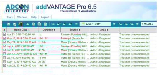 For monitored diseases, preventive treatment applications are recommended when the pressure index is extremely high (a minimum of six consecutive hours is recorded for three consecutive days in which the temperature is between 20–21 C). Time evolution of risk for each of these diseases and treatment recommendations are provided in Section 3.