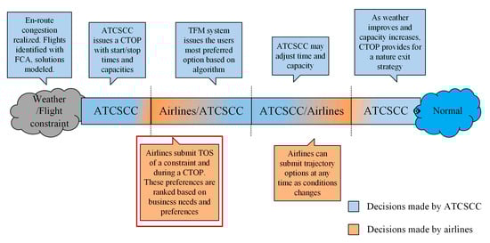 As the main operation mode of future air traffic, trajectory-based operations (TBO) [] are based on the four-dimensional trajectory of aircraft safety operation cycle, and through collaborative decision making (CDM) between ATCSCC, airlines, airports, aircraft, and other related parties which assign more flexible trajectories for flights to better meet the needs of airspace users. The CTOP is a new type of traffic management initiative for TBO. Based on the CDM mechanism, CTOP focuses on the FCA and takes the en-route resources (that is, the set of optional trajectory and the set of entry slots when the flights fly by the FCA) as the deployment object and uses a combination of rerouting and slot allocation strategies to solve the imbalance of demand and capacity in en-route and terminal airspace []. It achieves the efficient and equitable utilization of en-route resources. In this process, en-route resource allocation is no longer limited to the traditional point of considering only the demand of ATCSCC but adopts a distributed decision-making approach between ATCSCC and multiple airlines, incorporating airline trajectory preferences into the decision-making process, which effectively enhances the decision-making status of airlines in en-route resource allocation and improves their enthusiasm to participate in CDM.