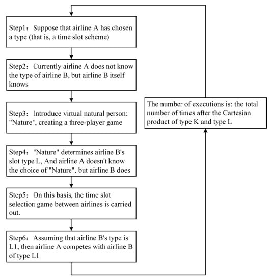 The second element is the participant’s strategy set, also known as the action set. That is, the non-empty finite sets A and B mentioned in Section 2. The airline’s strategy set is the option to provide each affected flight with an FCA and a corresponding certain entry slot. denote a slot selected by flight n of airline A from the FCA slot set, then the set denotes a combination of strategies for airline A.