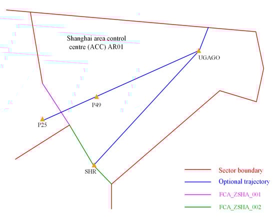 - To reduce computational complexity, when there are multiple trajectories in a single FCA, only the trajectory that is expected to enter the FCA earliest is considered []; this is because even sending multiple trajectory options for each FCA does not reduce global delay [].