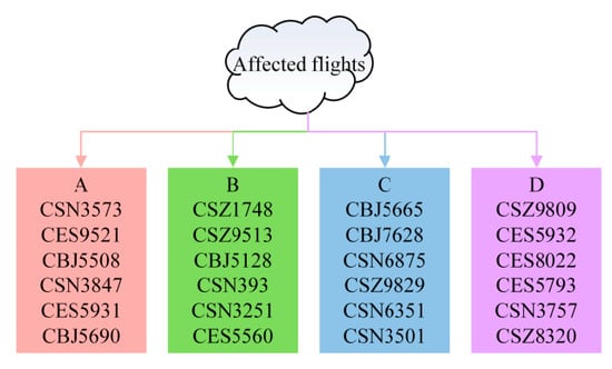 From the previous model analysis, it is clear that the complexity of the game model increases exponentially with the number of type sets as well as strategy sets. To reduce the model complexity, the affected flights are grouped modularly to reduce the number of type sets and action sets. The affected flights are grouped according to the average of the earliest time points at which they are expected to arrive at FCA1 and FCA2 at 15-min intervals, and the result of grouping the flights is shown in Figure 4.