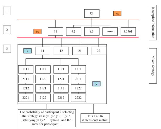 After the basic game parameters are given, the game needs to be Harsanyi transformed into a full information game model, and each payoff matrix in the game model is calculated using the mixed strategy solving method. The specific transformation process is shown in Figure 5.