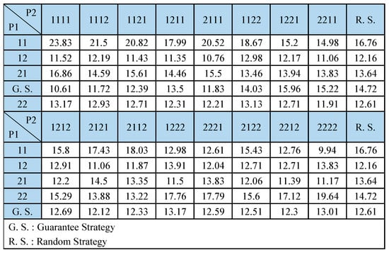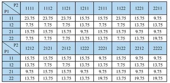 As shown in Figure 5, on the first level of the Figure, it is assumed that participant 1 has chosen type K1, and at this time participant 1 does not know the type of participant 2, but participant 2 knows it himself, so it is necessary to introduce the virtual participant “Nature”. On the second level of the Figure, it actually becomes a three-player game, and “Nature” decides that the type of participant 2 is L. From the above analysis, it can be seen that there are 6561 possible types of participant 2. For the choice of “Nature”, participant 1 does not know it, but participant 2 knows. On this basis, participant 1 needs to choose its own game strategy among 81 possible cases. For type K1, there are 6561 possibilities for participant 2 and so on, and the participant 1′s type set needs to face a total of possibilities for participant 2. So, participant 1 needs to find out the strategy that gives itself the advantage as much as possible inside the 531,441 possibilities, and at this point the linear programming method for mixed strategies can help the game model to be solved. Based on the above data, an example of the calculus for layer 3 is given here. When the type of layer 3 is K1 and L1, K1 is (17:00:18, 17:05:18, 17:08:27, 17:13:27), L1 is (17:03:26, 17:08:26, 17:06:17, 17:11:17, 17:10:16, 17:15:16, 17:12:03, 17:17: 03). When participant 1 and participant 2 select strategies “11” and “1111” respectively, i.e., when FCA1 is selected for all flights, the final flight time sequence is obtained (17:00:18, 17:03:26, 17:06:17, 17:08:27, 17:10:16, 17:12:03), based on this. The time sequence determines the order of slot assignments. The slots are assigned to six flights in turn, and the sum of delays obtained by participant 1 is calculated, from which the calculation of each element of the matrix is carried out, and so on, filling the 64 elements of the payoff matrix to form a complete payoff matrix; the payoff matrix under K1 and L1 types is shown in Figure 6.