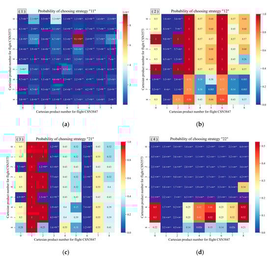 It shows the probability distribution of choosing different strategies for all types of participant 1 in Figure 7. From Figure 7a, we can see that in most cases, the probability of choosing strategy “11” for participant 1 is close to 0. Since the strategy of participant 2 is fixed here as “1111”, it is obviously unwise to choose strategy “11” when the competitors all choose FCA1. Figure 7b,c shows the probability that each of participant 1’s two flights will receive slots from different FCAs, which is typically higher than choosing a single FCA. Even when the competitor’s strategy is “1111”, pparticipant 1’s flights can gain a greater competitive advantage due to its higher arrival order among the flights participating in the game. This also suggests that in order to achieve stable performance, in many cases airlines should choose to allocate flights with different FCAs. Figure 7d shows two flights of participant 1 acquiring slots from FCA2, which is similar to Figure 7a, but with a larger overall probability than Figure 7a, mainly because pparticipant 2’s “1111” strategy allows participant 1 to avoid fierce competition by favoring FCA2 in choosing its strategy to select slots, thus gaining greater slots selection advantage.