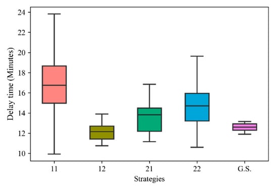 Figure 9 shows that among the five strategies, the total delay value of strategy “12” and the guarantee strategy is at a lower level, and the average value of strategy “12” is even lower than that of the guarantee strategy. However, in terms of robustness performance, the guarantee strategy is more advantageous. As the guarantee strategy always provides a more robust delay level for participant 1 regardless of the strategy chosen by participant 2, and the upper bound of its guarantee strategy is the lowest among the five strategies. This ensures that participant 1 can obtain a more stable and smaller delay loss in the game. Thus the guarantee strategy of the two flights of China Southern Airlines in group A chooses a delay value that is the maximum value of the guarantee strategy, which is both the lowest delay loss and more robust.