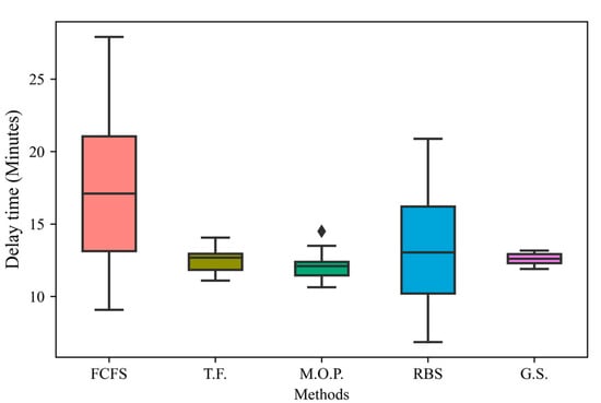 Comparison of delay values of CZ obtained by different methods. (In the M.O.P. method, because a strategy is more inclined to achieve the goal of a smaller fair loss deviation coefficient, the delay time of the strategy is longer, that is, the delay time of the strategy is an outlier shown in the figure).