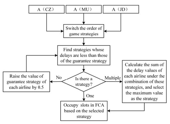 As shown in Figure 11, each airline in group A places their flights at the top when playing as a participant, resulting in inconsistent flight order in the three groups of games. It is necessary to first arrange the flight order of each airline according to the order in Table 2 and subsequently find the combination of strategies with delay values less than the guarantee strategy values of all airlines. When only one strategy exists, then that strategy is taken as the possible guarantee strategy of group A and occupies the slots in the FCA in turn, and when more than one strategy exists, the sum of the delay values of each airline under these strategies is calculated and the strategy corresponding to the maximum value is selected as the possible guarantee strategy to maximize the possible adjustment space of group A. Here, it can also be considered as the result of the non-cooperative game between group B and group A.
