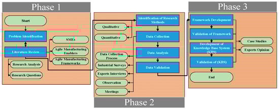 The research methodology adopted in this paper is comprised of three phases, as depicted by Figure 1. Phase 1 of the research deals with the problem of identification, followed by a detailed literature review. In this phase, an agile manufacturing implementation problem was identified, agile manufacturing enablers were explored, and agile manufacturing frameworks were investigated. The second phase of the research was related to research method identification, data collection, data analysis, and data validation. In this phase, data were collected through industrial surveys, expert interviews, meetings, and observation. For data collection, manufacturing SMEs which were already implementing agile manufacturing practices were targeted. The selected SMEs were performing business in the field of textile, automotive, electronics, furniture, and leather manufacturing. The CEO, production managers, and supply chain mangers were accessed for relevant data collection. The data collected include type of business, years of experience in business, agile manufacturing implementation experience, agile manufacturing capabilities of the organization, costs factors being employed for agility implementation, and output as an impact of agile manufacturing implementation. Annual reports related to performance output as a result of agile manufacturing implementation were also analyzed to validate the claims about postimplementation improvement. The final phase (phase 3) of the research was comprised of framework development, framework validation, KBS development, and KBS validation through case studies and expert opinions. In this phase, an impact assessment framework was developed based on literature investigation and industrial field study, whereas validation of the framework was performed through case studies and expert opinions. Furthermore, the KBS was developed based on the framework and validated through industrial implementation and expert opinions.