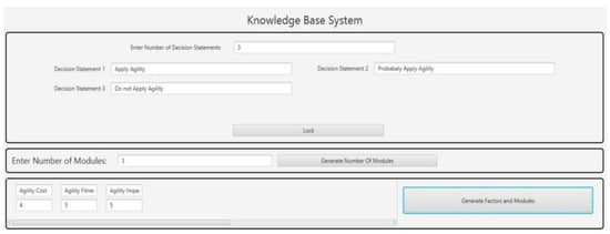 The developed KBS is very flexible and robust in its use, and detailed working of the KBS is shown by Figure 4. In first step, the platform requires the user to input identified needs in the form of a list and area of agility impact after detailed brainstorming with the management of organization. Then, the user is asked to input the impact of agility in that area in the second step corresponding to sustainability, lead time, responsiveness, inventory, and employee morale. In the third step, the user is then prompted to input the agility experience of SME in terms of first-time user, repeat user, and continual user. In step four, requirements for agility implementation in terms of manpower, consultancy, training, and system reconfiguration are input. In step five, the user is asked to input the number of agility cost parameters, their names, their linguistic variables, corresponding numeric values, and numeric ranges for the decision statement. The user utilizes the ‘perform calculations’ button to display agility cost results. In step six, the user is asked to input the number of parameters for agility fitness, their names, their linguistic variables, corresponding numeric value, and numeric ranges for the decision statement. The user then presses the ‘perform calculations’ button to display the agility fitness results. In step seven, the user is prompted with a window to input the number of parameters for agility impact, their names, their linguistic variables, corresponding numeric values, and numeric ranges for the decision statement. The ‘perform calculations’ button is pressed to see the results for the agility outcomes. In step eight, the user selects the results of agility cost, agility fitness, and agility impact to obtain a final decision about agile manufacturing implementation in the form of ‘do not apply agile manufacturing’, ‘probably apply agile manufacturing’, or ‘apply agile manufacturing’.
