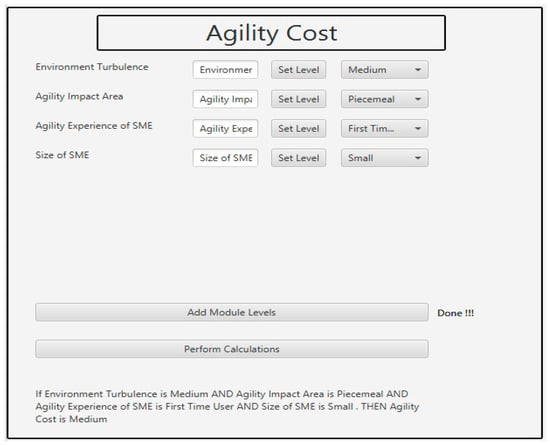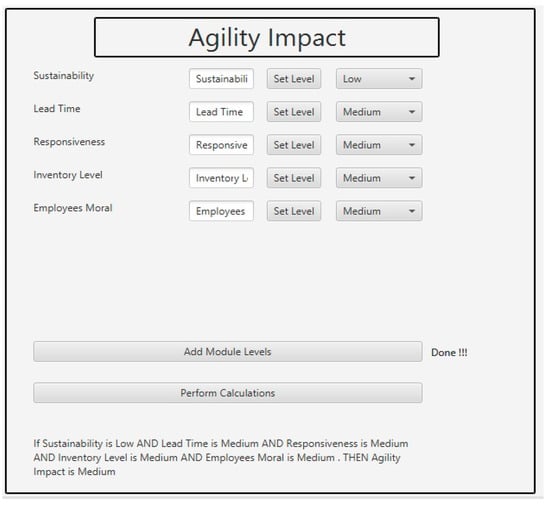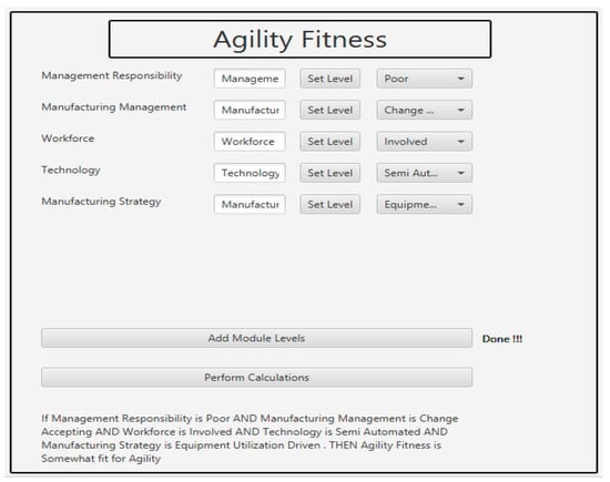 First of all, the company’s preliminary needs were assessed. Table 4 shows agility needs, area of agility impact, impact in that area, agility experience, and requirements for agility implementation. The number of factors for agility cost, agility fitness, and agility impact are put in the system according to the framework, as shown in Figure 5. The agility cost parameters’ values are input, and they include environment turbulence as medium, agility impact area as piecemeal, agility experience as first-time user, and size of SME as small. The result of the cost for this company is estimated to be medium, as shown in Figure 6. After that, agility fitness parameters are input, and they include management responsibility as poor, manufacturing management as change accepting, workforce as involved, technology as semiautomated, and manufacturing strategy as equipment utilization-oriented. The agility fitness result for the given company turned out to be somewhat fit for agility, as shown in Figure 7. After the agility fitness results, agility impact parameters are input, and they include sustainability as low, lead time as medium, responsiveness as medium, inventory level as medium, and employee morale as medium. The results for agility impact turned out to be agility impact is medium, as shown in Figure 8. The results of agility cost, agility fitness, and agility impact are selected for the given company to obtain final advice. Figure 9 shows that the decision for this studied company turned out to be probably apply agility.