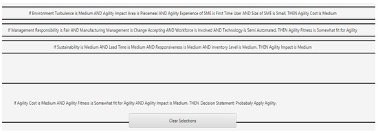 The results of these three subsystems contribute to the final decision made by this KBS. The system generates three decision statements based on the results of each subsystem; a sample is given in Table 3. These decision statements in the form of advice are “do not apply agile manufacturing”, “probably apply agile manufacturing”, and “apply agile manufacturing”.