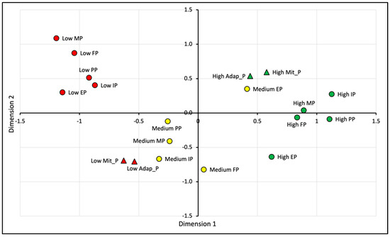 Multiple correspondence analysis—Homals. Note: Financial performance (FP); innovative performance (IP); production performance (PP); market performance (MP); export performance (EP); mitigation practices (Mit_P); adaptation practices (Adap_P). Source: Prepared by the authors.