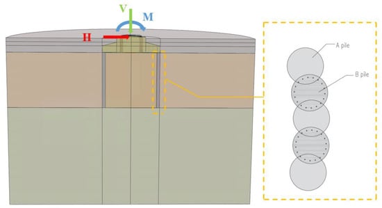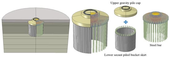 The innovation SPBF is unique in structure and has certain advantages in construction cost. It is the first time that the secant pile support structure in municipal engineering is creatively applied to the wind power foundation. The SPBF consists of the upper (gravity) pile cap and lower (secant piled) bucket skirt. The lower bucket skirt is creatively composed of overlapping (secant) plain concrete piles and reinforced concrete piles, the detailed schematic is shown in Figure 1. At present, the first SPBF has been successfully applied to a 3.3 MW wind turbine in Jilin and has been connected to the grid for power generation. After a period of structural health monitoring, the results show that the onshore wind turbine with SPBF can operate safely. The project has proven that the SPBF could save approximately 40% of the land occupation, 22% of steel bars consumption, and 9% of concrete consumption compared with the 3.3 MW traditional onshore wind turbine foundation in the same wind farm (see Figure 2). It has been proved that SPBF will have great application prospects after structural optimization and production in the future. However, whether the SPBF has sufficient bearing capacity and safety margin, and what causes the foundation failure, is not clear, and needs further study.