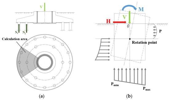Since SPBF has the characteristics of a pile foundation and bucket foundation, the bearing mode of SPBF is unclear. The bearing mode of prestressed tubular foundation relies on the inner and outer earth pressure of the bucket skirt to resist the external force, while that of the pile foundation mainly relies on the side friction and tip resistance provided by the friction between piles and soil to resist external forces (see Figure 3). It is necessary to figure out whether the SPBF is analyzed according to the pile foundation or prestressed tubular foundation in the Code for Design of Wind Turbine Foundations for Onshore Wind Power Projects (NB/T 10311-2019) [8]. That will affect the choice of the bearing capacity calculation method of SPBF in the design stage.