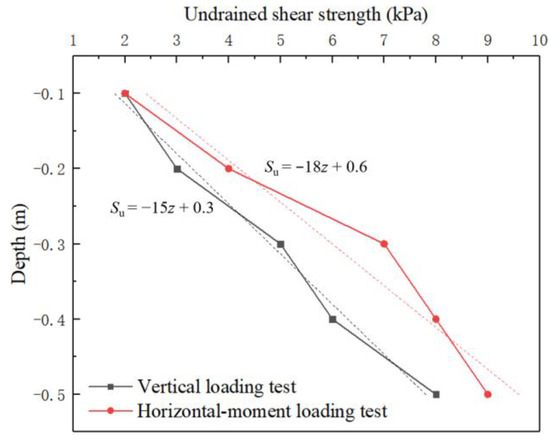 where Su0 is the undrained shear strength at depth z (kPa), Sum is the undrained shear strength of clay at the surface (kPa), z is the depth (m), and k is the growth coefficient of soil strength. The k value is the slope of the fitting curve of the undrained shear strength in different depths (see Figure 5). The k values in the vertical loading test and horizontal–moment loading test are −15 and −18, respectively.