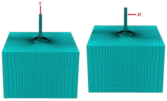 For the FE model of model test, the displacement control method is adopted, which is widely used to calculate the bearing capacity of the bucket foundation in FE models [21,28,30]. Extract the displacement and load of the reference point, and draw them into the load–displacement curve, when the curve has an inflection point or reaches a certain displacement, it is determined that the foundation has reached its limit state. In the simulation of the vertical loading test, the displacement is coupling on the reference point at the center of the top of the rigid loading rod, while in the simulation of the horizontal–moment loading test, the horizontal displacement is coupled on the reference point on the side of the rigid loading rod that is located at the loading height of 0.4 m from the top of the pile cap. The loading states and FE models are shown in Figure 6. No displacement and rotation are adopted to the bottom boundary of soil (U1 = U2 = U3 = UR1 = UR2 = UR3 = 0), and horizontal displacement and vertical rotation are not allowed to the lateral boundary of soil (U1 = U2 = UR3 = 0).