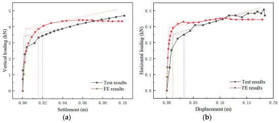 The comparison results illustrate that the overall trends of FE results and test results are consistent. The deviation of vertical bearing capacity is 10.65%, while that of horizontal–moment bearing capacity is 10.25%. It is worthwhile to mention that the boundary conditions set in the FE models are reasonable, and the model tests can be accurately simulated by the FE method.