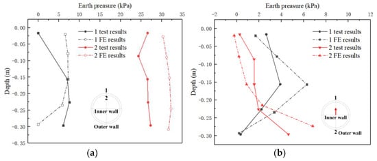 Comparison of earth pressure distribution curves between FE results and test results. (a) The comparison of vertical loading test. (b) The comparison of horizontal–moment loading test.
