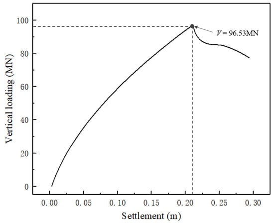The vertical load-settlement curve of the SPBF is shown in Figure 11. The result shows that the vertical bearing capacity of the SPBF is 96.53 meganewton (MN) with a settlement of 0.21 m. The vertical load of SPBF firstly increases with the increase of settlement, but after the settlement reaches 0.21 m, which is the ultimate state of SPBF, the vertical load on the SPBF drops rapidly. The ultimate settlement is twice of 0.1 m, which is the allowable settlement of the Code for Design of Wind Turbine Foundations for Onshore Wind Power Projects (NB/T 10311-2019), meaning that SPBF has twice the safety margin [26]. However, the ultimate settlement value has not reached 0.03 to 0.07 times the diameter of the bucket skirt, which is the settlement of foundation failure on soft soil for the gentle vertical load-settlement curve, proposed by Hesar [46] and Vesic [47]. In addition, the trend of the vertical load-settlement curve is different from the trend caused by the soil failure. The above analysis illustrates that the failure of the SPBF is caused by structural damage.