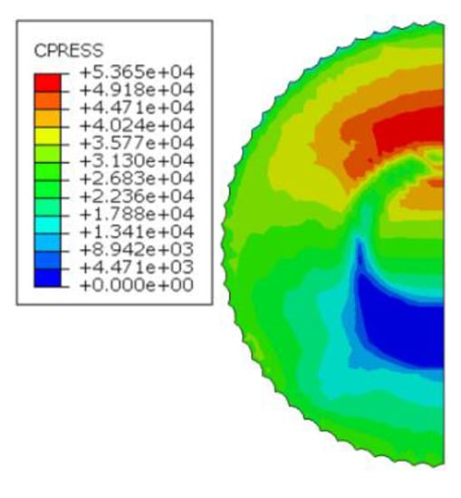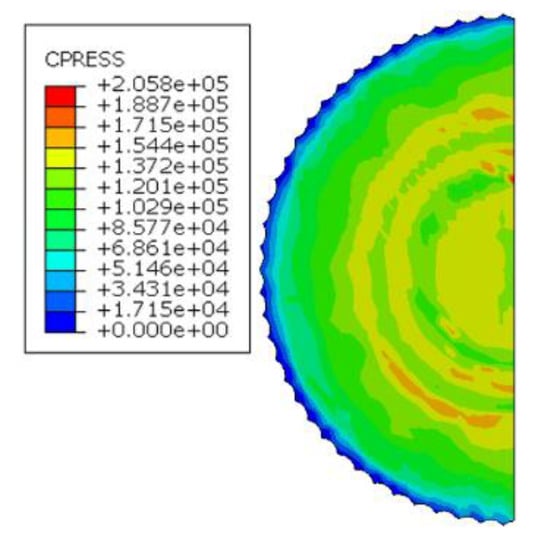 The surface-to-surface contact pair with an allowed finite sliding is applied to simulate the bucket–soil interface. The normal contact behavior between the bucket skirt and soil adopts the “hard” condition with no allowed separation after contact condition, while the tangential contact behavior is defined as “rough” contact condition to simulate the undrained behavior of clay [44,48,49].