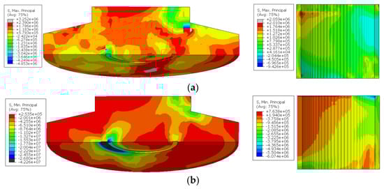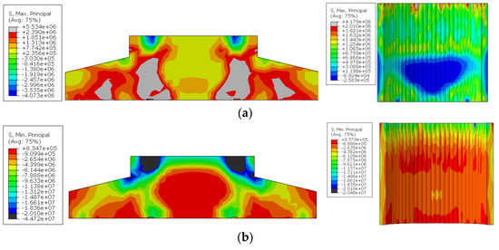 The stress contours of SPBF under vertical load. (a) Max. principal stress contour of SPBF. (b) Min. principal stress contour of concrete.
