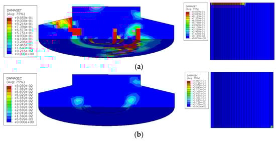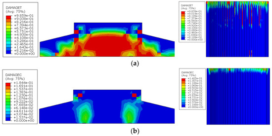 The damage contours of SPBF under vertical load. (a) DAMAGET contour of SPBF. (b) DAMAGEC contour of concrete.