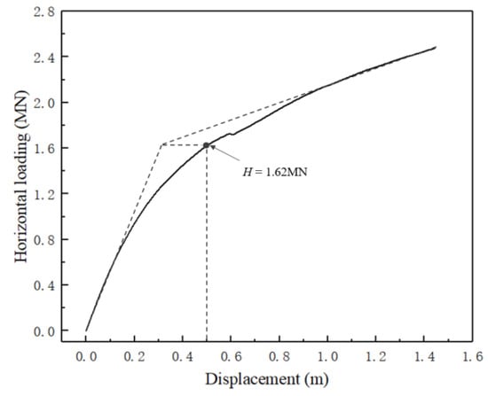 The horizontal load–displacement curve of the SPBF is shown in Figure 16. The result shows that the horizontal–moment bearing capacity of the SPBF is 1.62 MN with a displacement of 0.50 m. The trend of the horizontal load–displacement curve is similar to the trend of curve of the horizontal–moment loading test in Section 2.3.