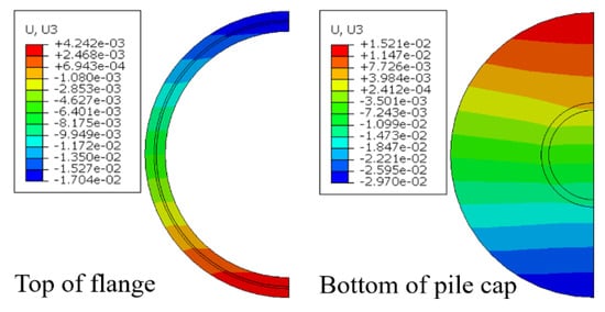 In the analysis of the bearing mode, in order to clarify the bearing mode of the SPBF under the action of the composite load in the actual project, the engineering load is coupled on the reference point at the top of the flange. The Fxy = 894 kN, Fz = −4358.9 kN and Mxy = 99,672.06 kN·m, while in the analysis of the bearing capacity and failure mode, the distance between the loading point and the foundation can be calculated as 111.49 m through the horizontal and bending moment loads of the actual project [41]. The effect of horizontal–moment load on the foundation of the wind turbine is simulated by applying horizontal displacement at this reference point, and the failure load can be further predicted. Due to the symmetry, only half of the FE model is adopted in the bearing capacity and failure mode analysis, the displacement is vertical to the symmetry plane, and the rotation with the axis in the symmetry plane are not allowed (U2 = UR1 = UR3 = 0).
