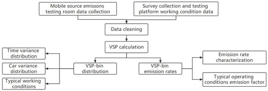As shown in Figure 1, we obtained metadata from mobile source emission testing room and survey and collection platform work data, and performed VSP calculation after data cleaning to obtain VSP-bin distribution and VSP-bin emission rate. After obtaining the VSP-bin distribution, we analyze them for time difference distribution, vehicle difference distribution, and typical working conditions, and after obtaining the emission rate, we conduct the characterization and study of emission factors for typical working conditions.